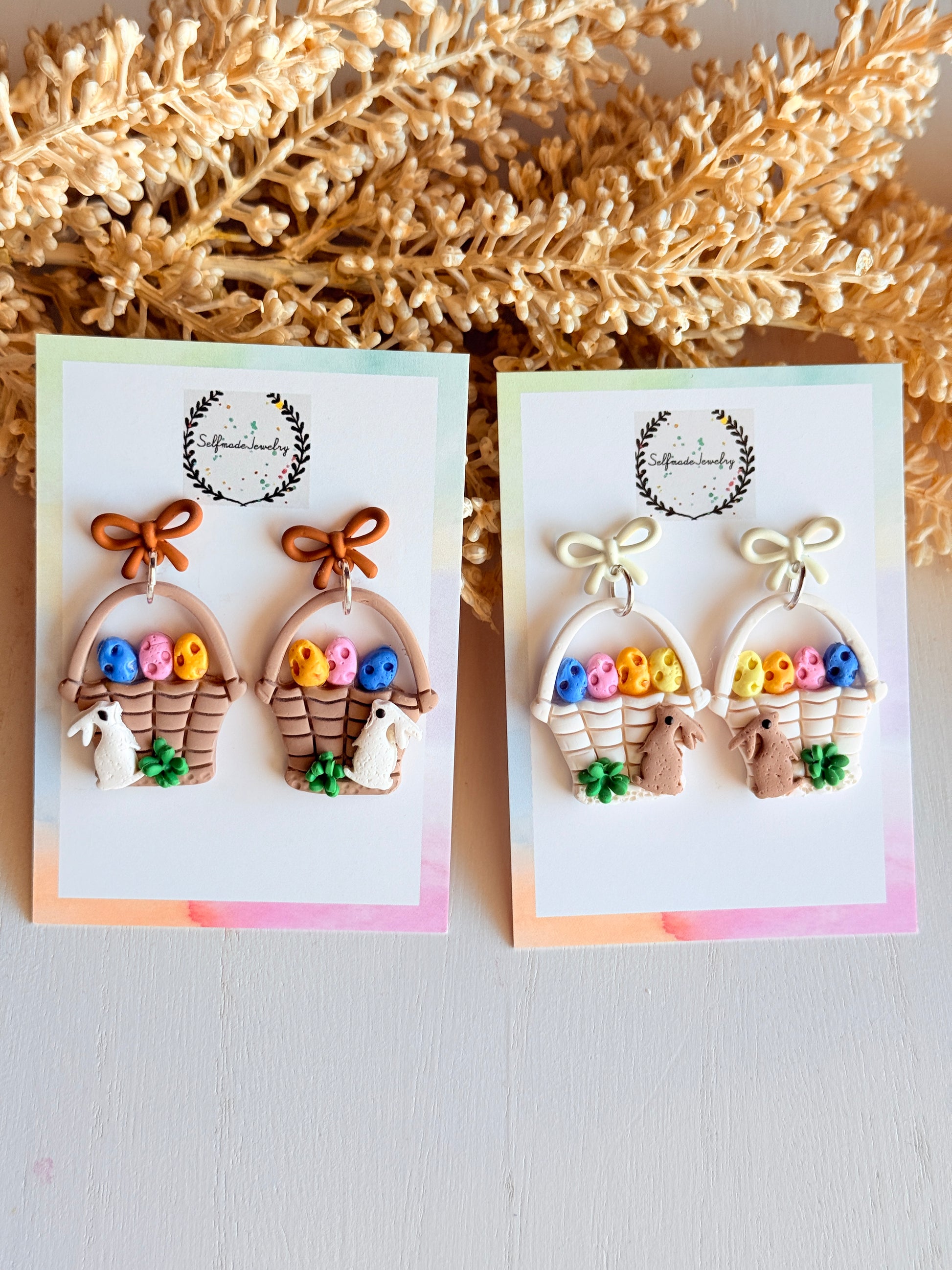 Polymer Clay Easter Basket Earrings, Bunny Eggs Dangles, Handmade Spring Jewelry, Bow Studs